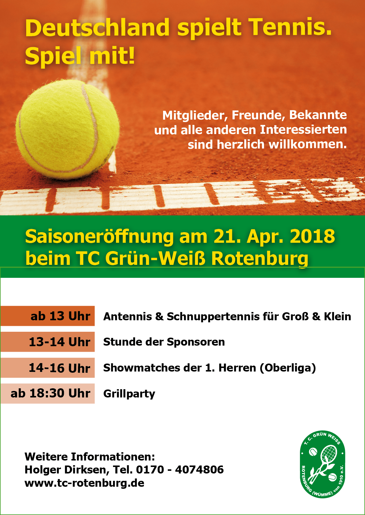 Die Sommersaison steht vor der Tür und nach einem langen Winter sind wir alle froh, endlich wieder unter freiem Himmel unserem gemeinsamen Hobby, dem Tennissport, nachgehen zu können. Wie in jedem Jahr, wollen wir die Saison gemeinsam mit einem Antennis-Turnier beginnen. Los geht’s ab 13 Uhr. Eingeladen sind alle Mitglieder von klein bis groß und von jung bis junggeblieben.