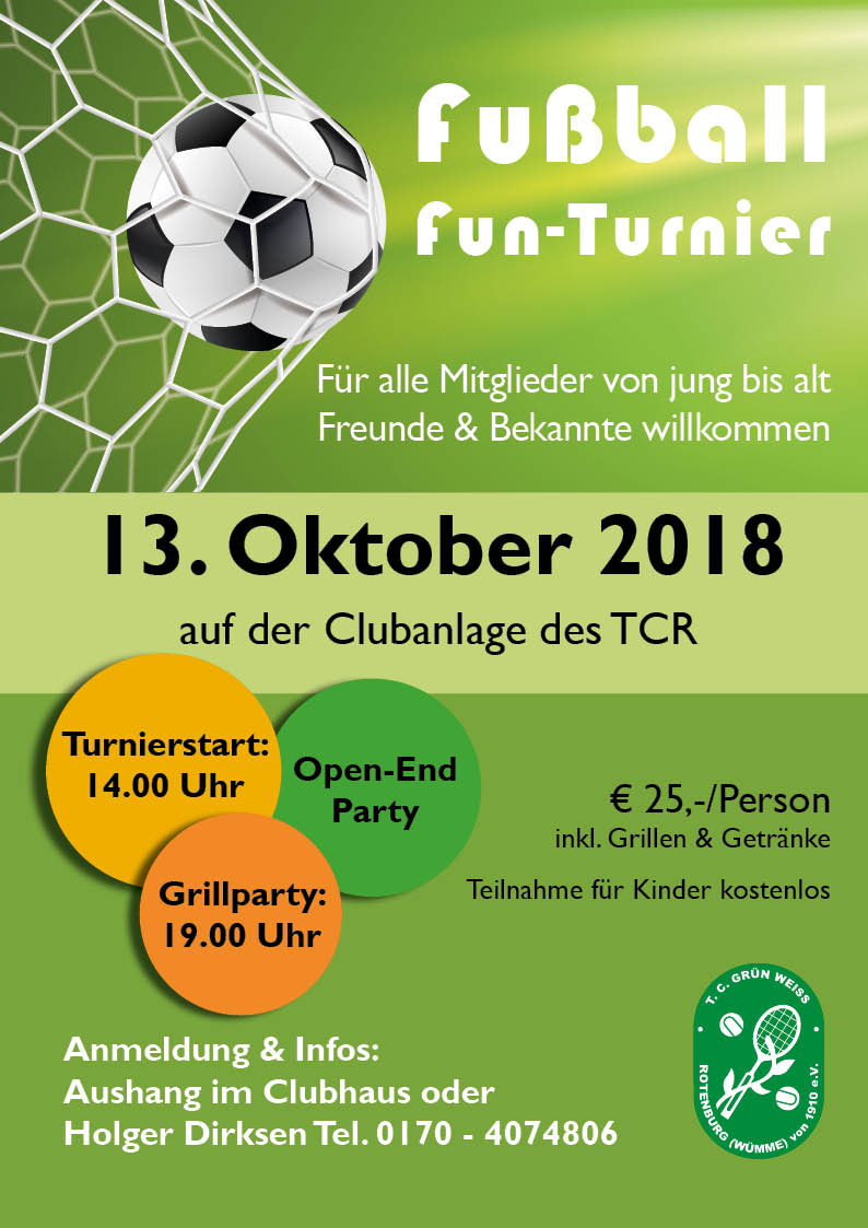 Mittlerweile hat das Fußball Fun-Turnier seinen festen Platz in unserem Veranstaltungskalender. In diesem Jahr treffen wir uns am 13. Oktober zum gemeinsamen kicken. Mitmachen können jung und alt, Männlein und Weiblein. Die Teams werden vor Ort gelost.