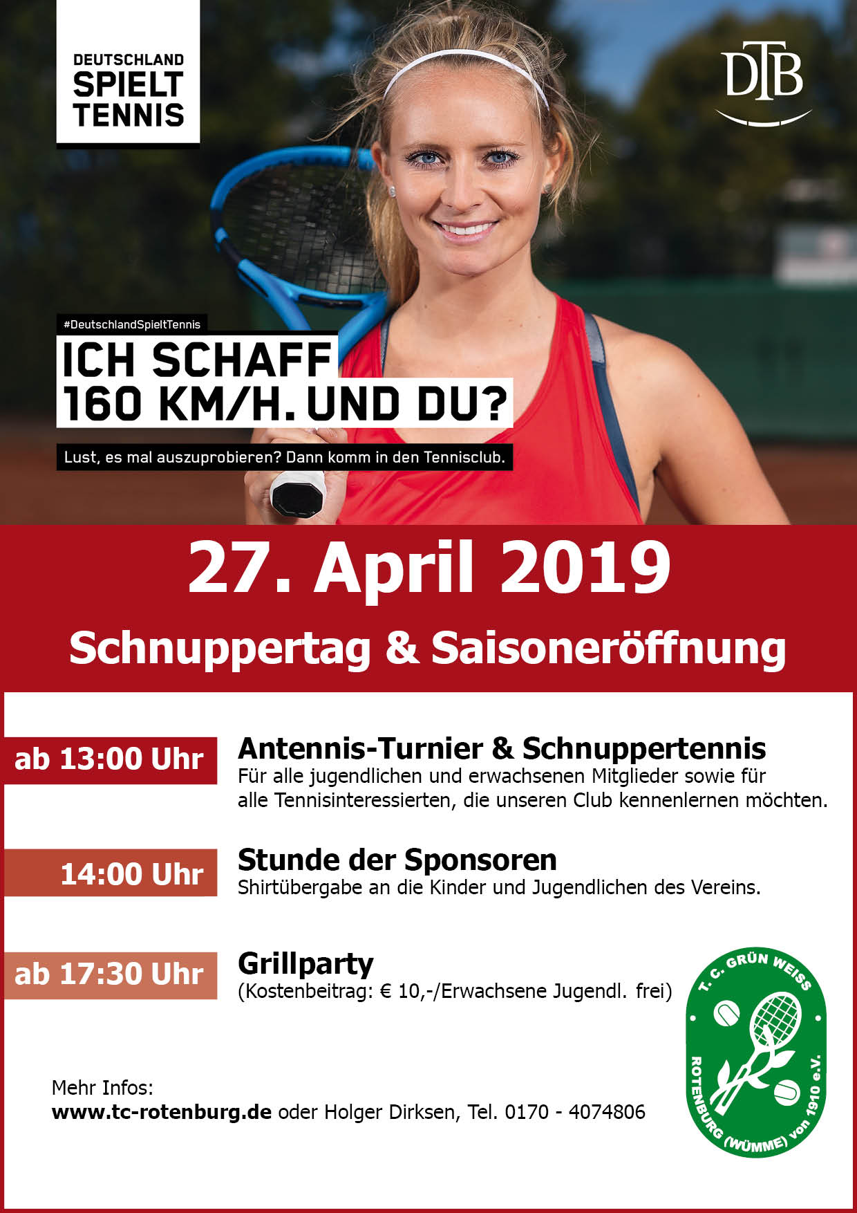 Ab 27. April 2019 fliegen bei uns die Bälle wieder über die Netze auf unseren Außen-Courts, denn dann eröffnen wir im Zuge der bundesweiten Aktion „Deutschland spielt Tennis“ offiziell die Sommersaison.