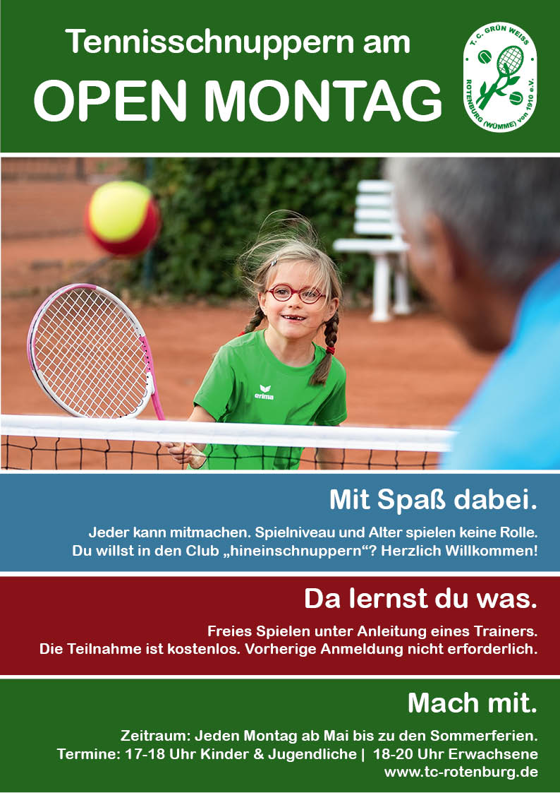 Du wolltest schon immer mal in den Tennissport hineinschnuppern, hattest bisher aber keine Gelegenheit? Du hast lange nicht gespielt, würdest aber gern wieder einsteigen? Du suchst nach einem neuen Club oder bist neues Mitglied bei uns? Dann komm einfach vorbei am Open Montag!
