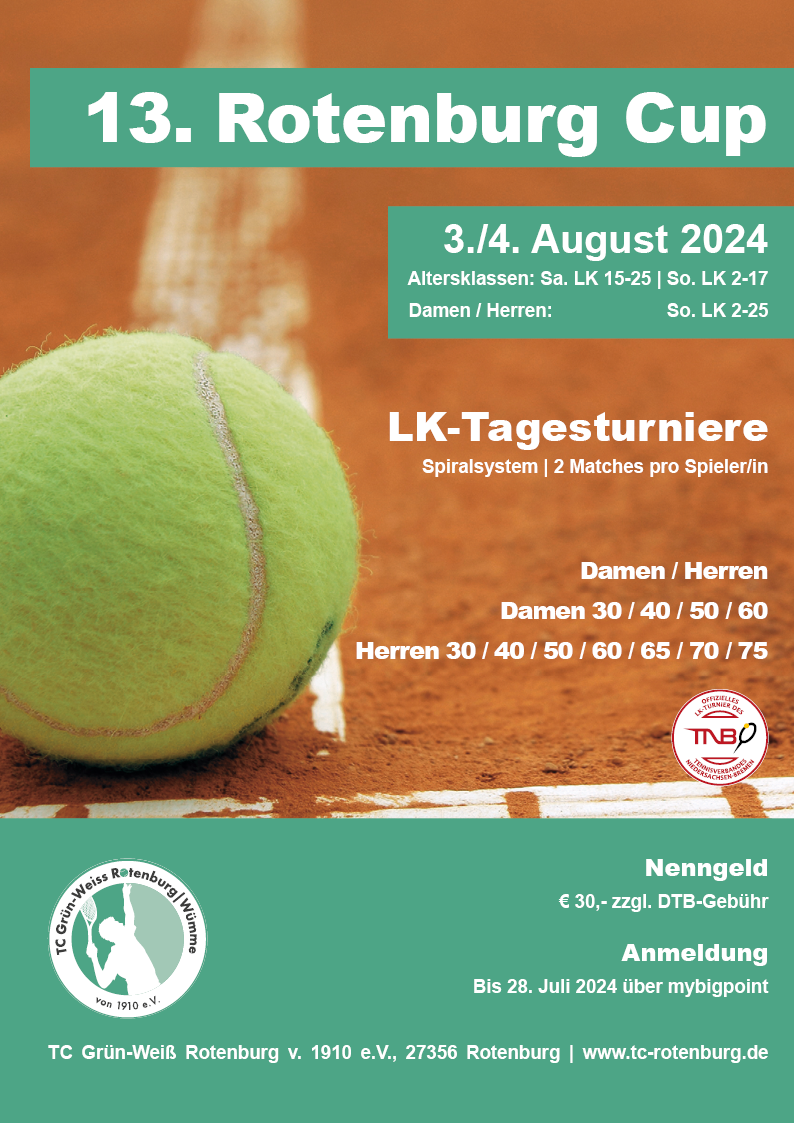 Der Rotenburg Cup hat sich in unserem Turnierkalender lange etabliert und ist eines der beliebtesten LK-Turniere im Umkreis. Bereits zum 13. Mal finden diesen beiden Einzel-Tagesturniere nun schon statt. Seid dabei und meldet euch gleich für eure Konkurrenz an.