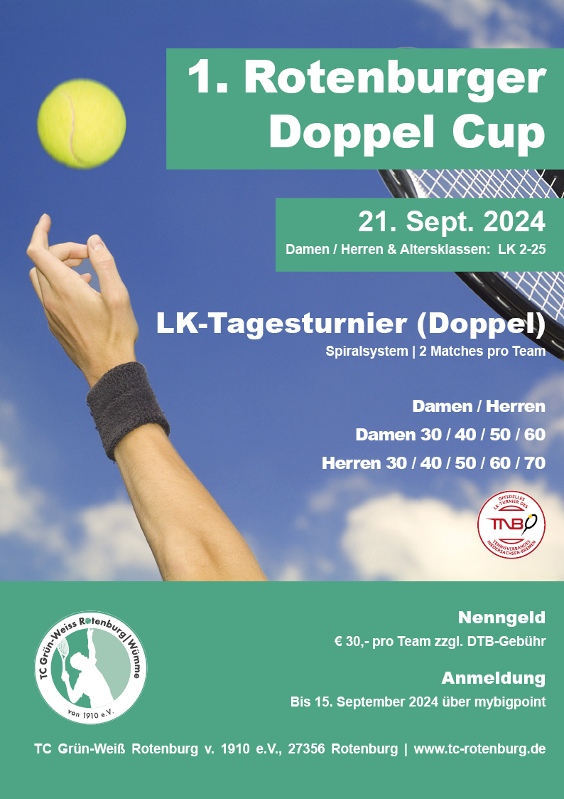 Erstmals richten wir 2024 auch ein LK-Turnier für die Doppel-Freunde unter euch aus. Ausgeschrieben ist das Doppelturnier für die Leistungsklassen 2-25. Seid dabei, wenn die Premiere des Rotenburger Doppel Cups stattfindet!